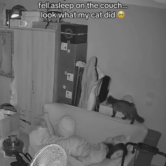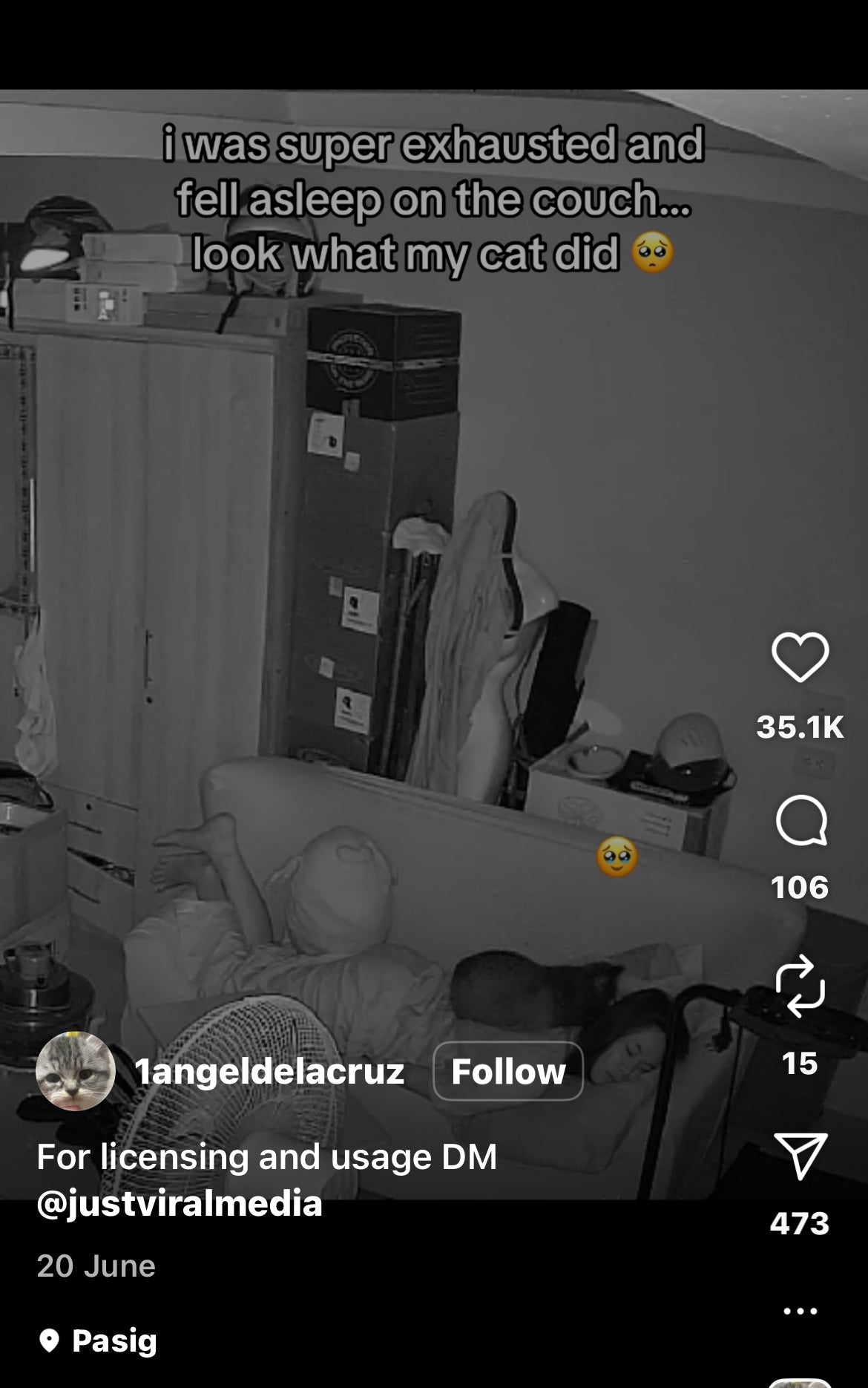 After a long, exhausting day, the owner dozed off on the couch — but her attentive cat wasn’t about to leave her alone. In the heartwarming night-vision footage, the cat climbs gently onto her back and begins to knead, as if giving a massage to help her rest. The sweet moment was shared on Instagram by @1angeldelacruz on June 20, 2025, where it warmed hearts everywhere, earning over 35,000 likes and 388,000 views.