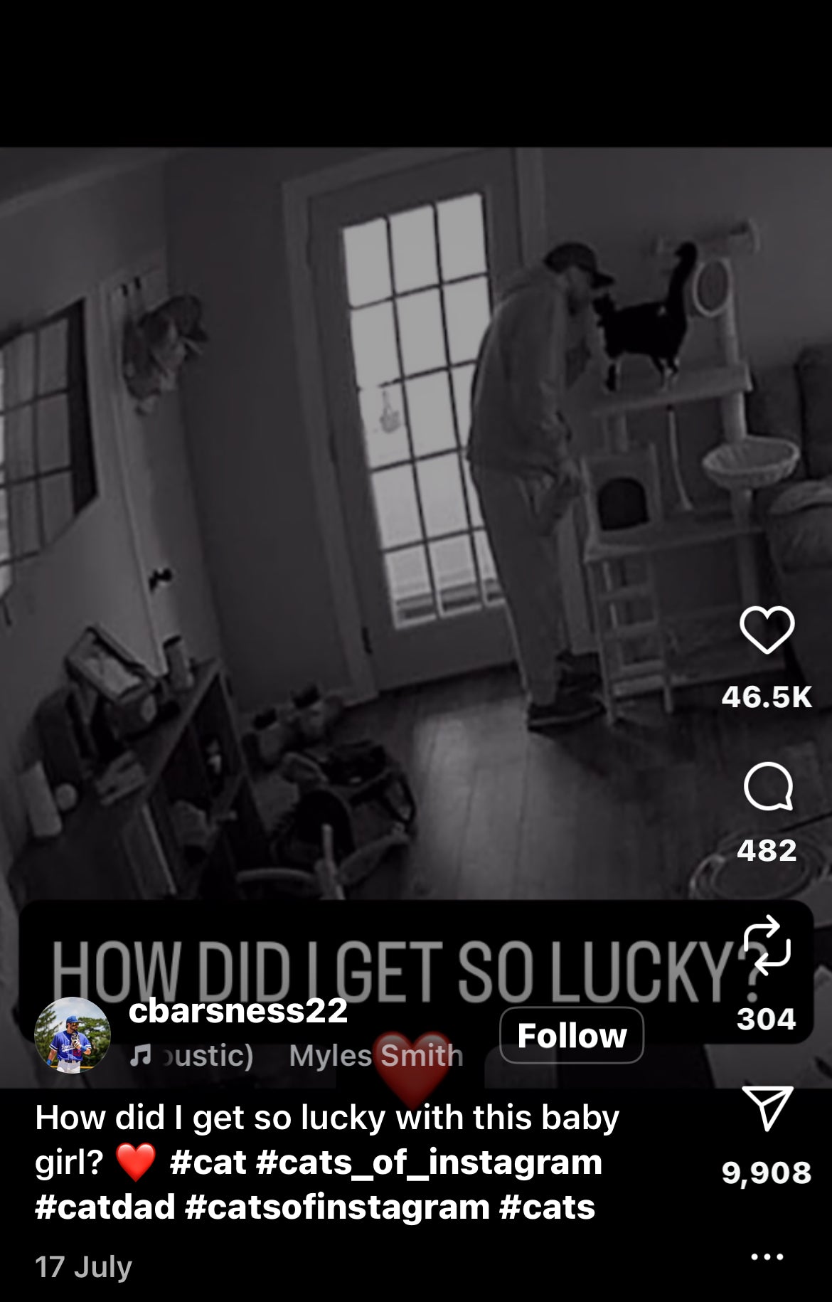 A compilation of security footage captures a man leaving for work each morning, as his cat rushes to the top of the cat tree to give him a goodbye kiss every time. This heartwarming video was posted on Instagram by @cbarsness22 on July 17, 2025, where it received over 46,000 likes and 366,000 views.