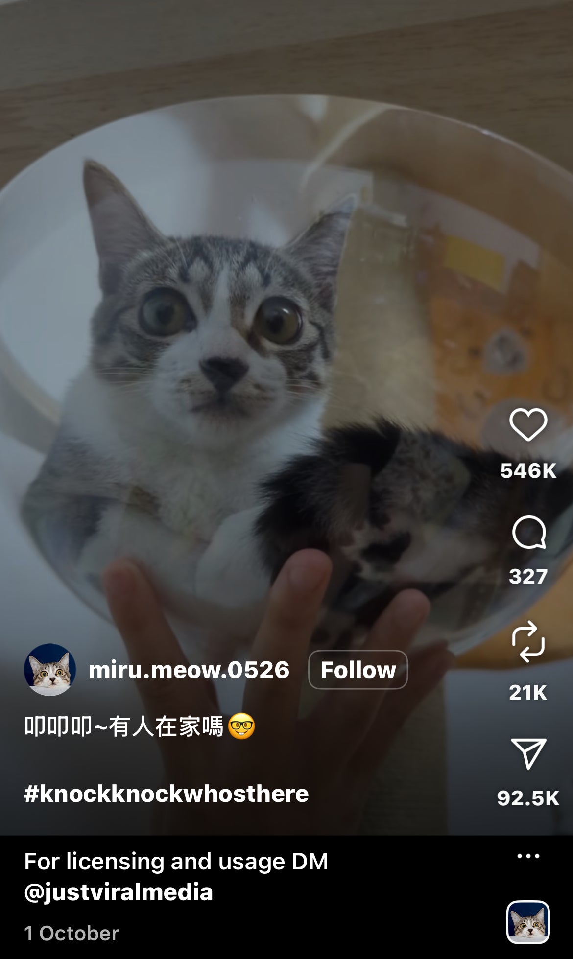 This cat was peacefully napping inside its clear bowl — its favourite cozy spot — until its owner decided to playfully knock on the glass. The startled feline instantly looks wide-eyed and confused, as if questioning the sudden interruption to its rest. The hilarious moment was shared on Instagram by @miru.meow.0526 on October 1, 2025, where it quickly went viral, receiving 546,000 likes and over 4.5 million views.