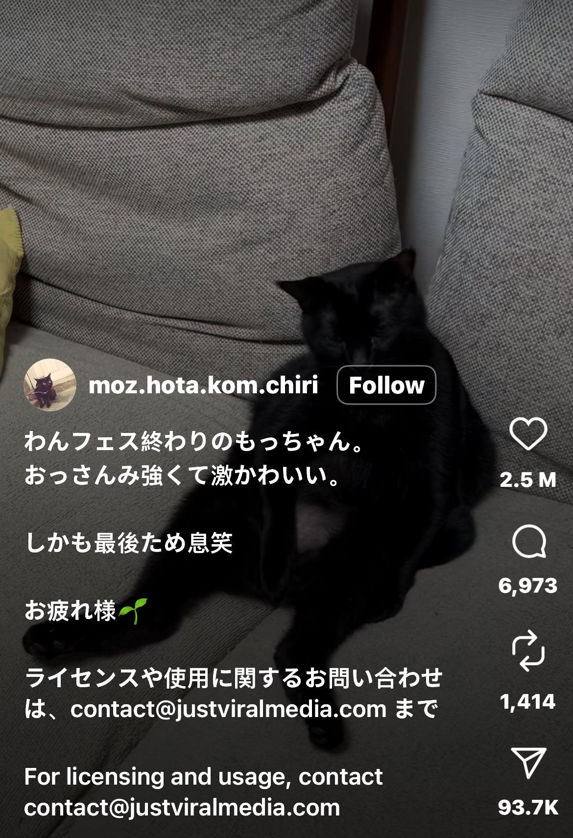 A black cat sits slouched on the couch in a hilariously human-like pose, looking as though he owns the place. The clip quickly captured hearts online and went viral after being posted on Instagram by @moz.hota.kom.chiri on October 27, 2024, where it received over 2.5 million likes and 29 million views.