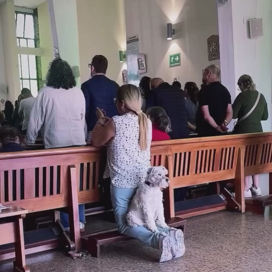 Inside a quiet church, a woman kneels at her pew in prayer — and right behind her, her small white dog sits upright on her calves, perfectly balanced and seemingly joining in the moment. The clip was shared on Instagram by @workouterritory on October 2, 2025, where it quickly went viral, receiving over 592,000 likes and 5.2 million views.