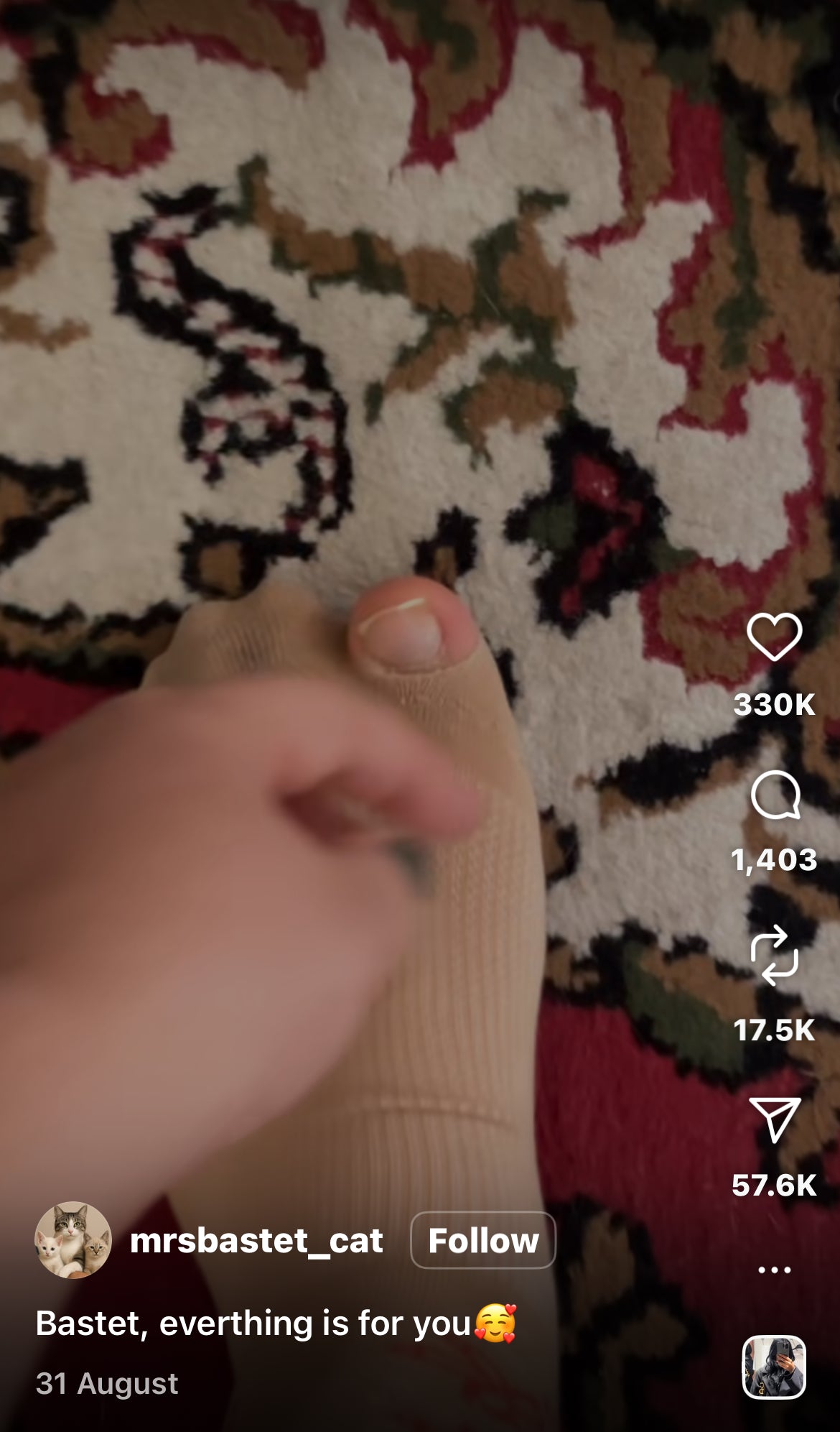 A lighthearted video showing a pet owner with socks full of holes, highlighting how little they spend on themselves—only to reveal a huge pile of treats and food bought for their cat. The clip perfectly captures the priorities of a true cat parent. It was posted on Instagram by @mrsbastet_cat on 31/08/2025, where it quickly gained attention, earning over 330,000 likes and 3.1 million views.
